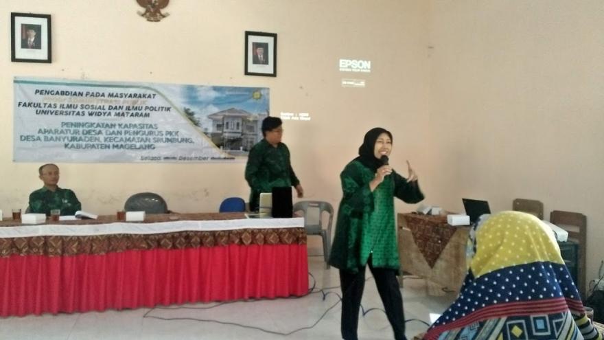 Kegiatan diawali dengan penandatangan kesepakatan kerjasama antara Universitas Widya Mataram Yogyakarta yang diwakili oleh Dekan Fakultas Ilmu Sosial dan Ilmu Politik Suwarjo SIP.,MSI dengan Pemerintah Desa Banyuadem serta penyerahan cenderamata yang diwakili oleh Kaprodi Fisipol Widyamataram Dra. Syakdiyah, MSI. Sementara dari pihak Pemerintah Desa Banyadem diwakili oleh Sekdes Anjar Wiyanto. Kemudian acara dilanjutkan dengan sesi pemaparan materi, pemaparan materi pertama disampaikan oleh Dosen SL Harjanta SIP.,MSI dengan tema "Keterbukaan informasi publik dan penguatan Good Governance di Pemerintah Desa". Selanjutnya pemaparan materi berikutnya disampaikan oleh Dosen Dr. Oktiva Anggraini,S.IP, M.SI, dengan tema "Perempuan Mbangun Deso" yang sasaran utamanya adalah para Ibu-ibu kader PKK Desa Banyuadem. Setelah selesai pemaparan materi, acara dilanjudkan sesi tanya jawab.